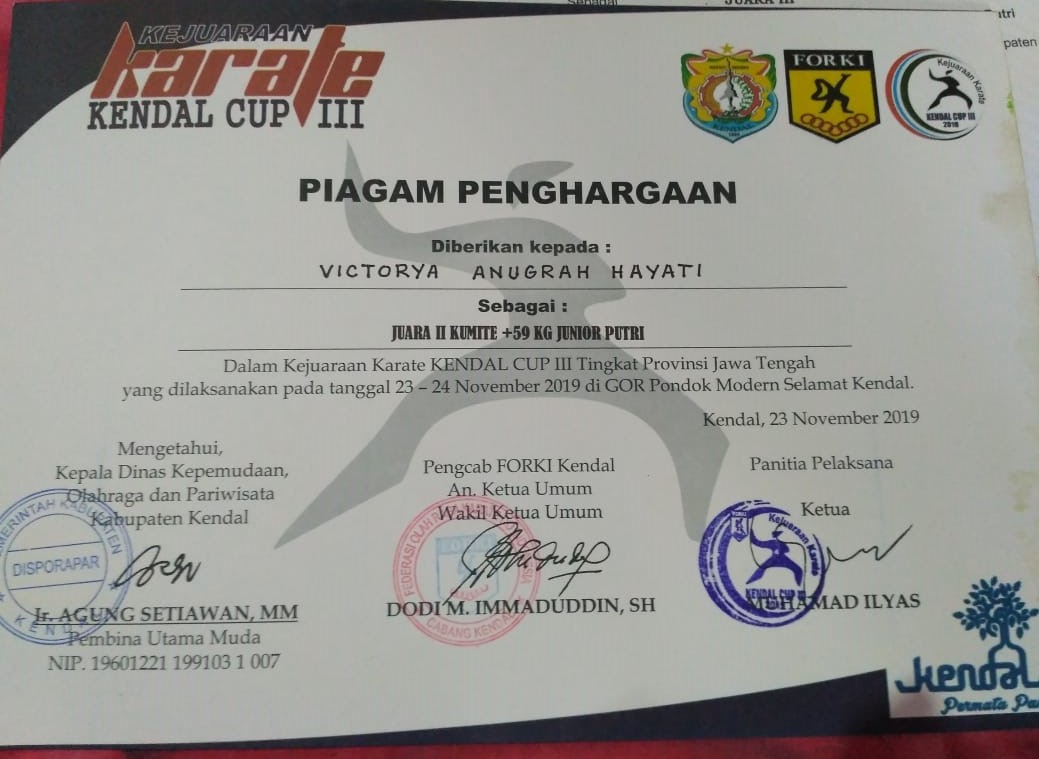 Juara II Tingkat Kabupaten Kendal Karate Kumite +59 Kg - 23 November 2019